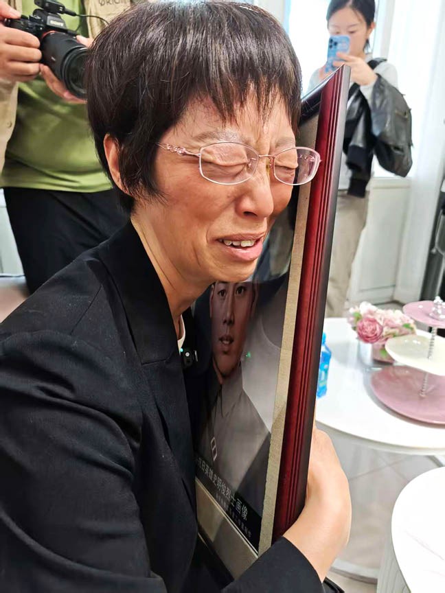 林宇辉退休后,发起了为革命烈士免费画像的公益计划。图为河北清河县抗日英雄史明俊的外孙女抱着姥爷的画像失声痛哭。