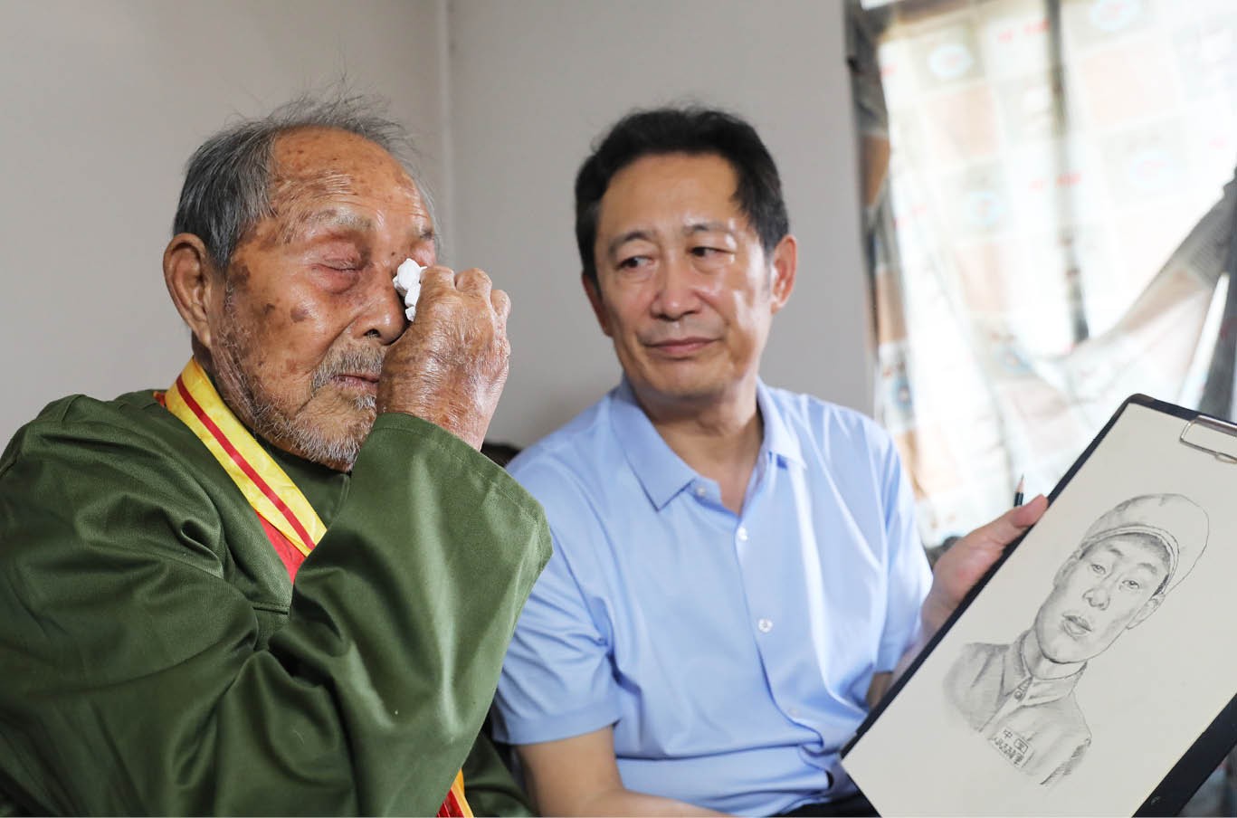 2022年,林宇辉来到山东蒙阴县96岁老兵闫兴福家中,根据老人描述画出了牺牲战友周名的肖像。