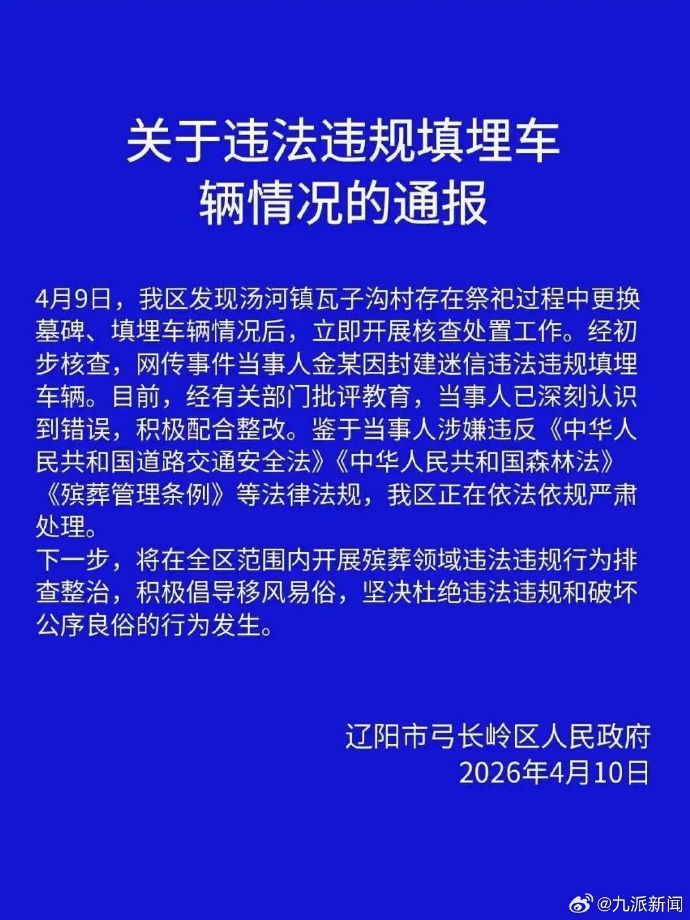 4月9日,我区发现汤河镇瓦子沟村存在祭祀过程中更换墓碑、填埋车辆情况后,立即开展核查处置工作。经初步核查,网传事件当事人金某因封建迷信违法违规填埋车辆。